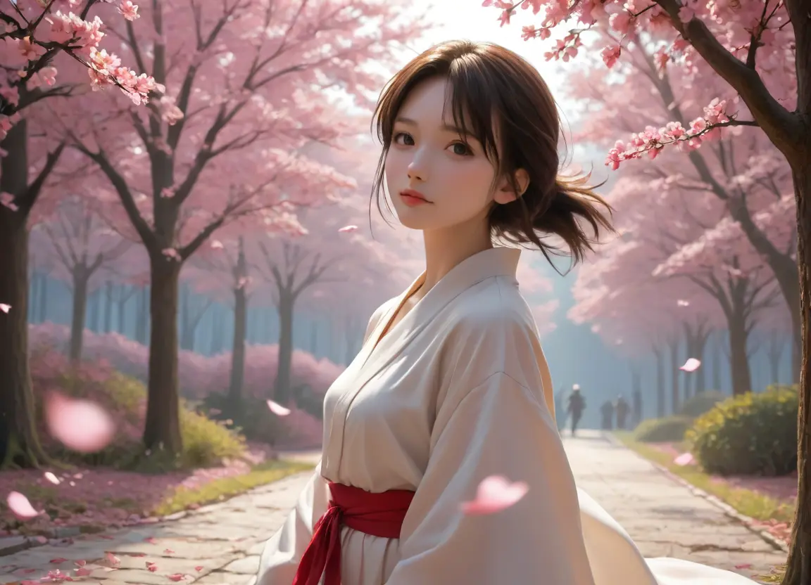 “Anime style, vibrant colors, cherry blossom petals falling, graceful figure in traditional clothing, soft pastel lighting, Studio Ghibli atmosphere, 60fps smooth animation”
